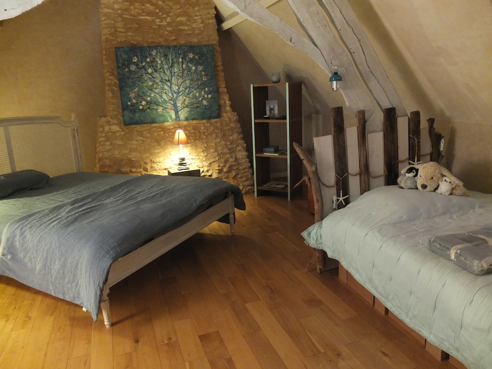 Votre espace privé se situe au-dessus de la cuisine et du petit salon (escaliers): deux chambres en enfilade et une salle d’eau avec douche. Dans la pièce sur le palier, à votre disposition une bouilloire, de la vaisselle et un micro-ondes pour votre repas du soir.